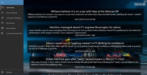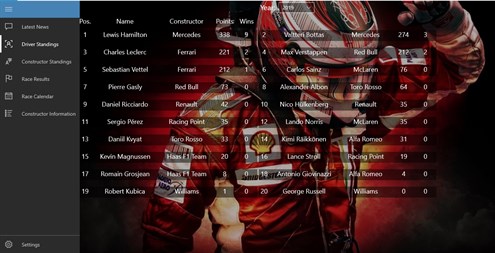 This program is designed to help you keep up with the latest news from the world of Formula One, but it is also a great tool if you want to check the current Driver or Constructor Standings. You can get detailed informations about each driver or team and thanks to the Calendar syncronisation, you will never miss a Race. If you like statistics, this app is going to be your partner throughout the entire season. If you have got any questions or suggestions about the application, feel free to contact me!