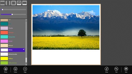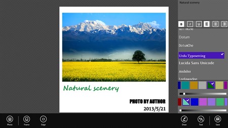 Foto Tag allows you to add frame and border on your photo, then you can add customize text or paint arbitrary on the photo . Save the photo to your local and share them among your friends.