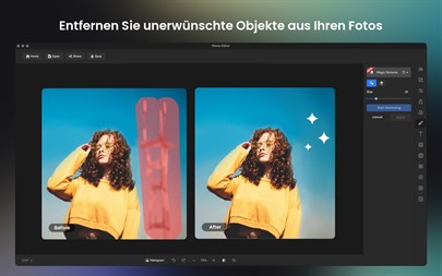 [Unerwünschtes Objekt entfernen] Mit Fotors Zaubereraser entfernen Sie schnell unerwünschte Objekte aus einem Bild, wie Text entfernen, Personen entfernen, Akne entfernen, Gebäude entfernen und mehr. Unser Wasserzeichenentferner ist eine gute Wahl für bessere Kreationen. Entfernen Sie Wasserzeichen automatisch und erhalten Sie mit einem Klick ein perfektes Bild, ohne die Bildqualität zu verlieren.