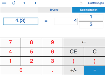 ► BRÜCHE IN DEZIMALZAHLEN UMWANDELN Dieses Rechner wandelt Brüche in Dezimalzahlen um und umgekehrt. - Umwandeln von echten und unechten Brüchen und Gemischte Zahlen in Dezimalzahlen / periodische Dezimalzahlen. Umwandlung von Bruchzahlen in Dezimalzahlen: wählen Sie ‘Brüche’, geben Sie eine Bruch oder gemischte Zahl ein und klicken Sie auf "=". Das () im Ergebnis zeigt den Periode an. - Umwandeln von endlichen und periodischen Dezimalbrüchen in Brüche. Umwandlung von Dezimalzahlen in Brüche: wählen Sie "Dezimalzahlen", geben Sie eine Dezimalzahl ein und klicken Sie auf "=". Bitter Geben Sie eine Dezimalzahl in folgendem Format ein: Vorkommastellen.Nachkommastellen. Bsp.: 8.95 für 8,95. Gib die periodische Zahl in Klammern ein - 1.23(4) für 1,23444...(periodische Dezimalzahl). - Runden auf die nächste 1/2, 1/4, 1/8, 1/16, 1/32, 1/64, 1/128, 1/256.