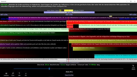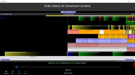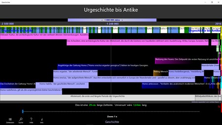 Geschichte: Vom Urknall bis heute Zoome und scrolle durch geschichtliche Ereignisse und Perioden in acht maßstäblichen, vergleichbaren Zeitleisten. Jeder Eintrag hat eine kurze Erklärung und einen Link in Wikipedia.