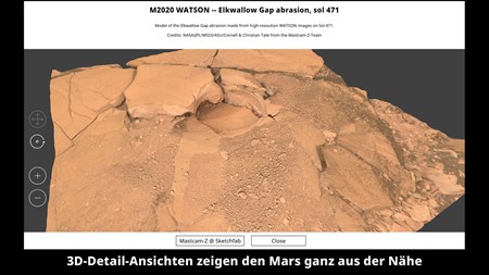Seit Version 0.7 sind jetzt beeindruckende Detailansichten, die aus den Fotos von Percy und Ingy per Photogrammmetrie erstellt wurden. Schauen Sie sich die Steine und Felsformationen an, als ob Sie direkt vor Ort auf dem Mars sind! Diese tollen Detail-Ansichten sind in die M2020-Verlaufs-Liste integriert worden.