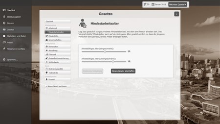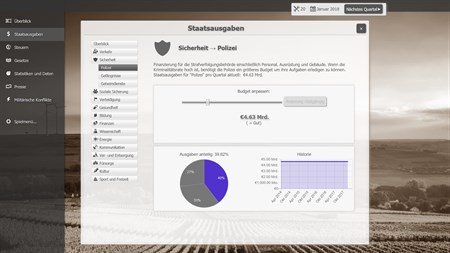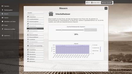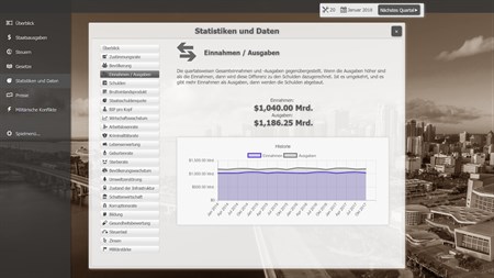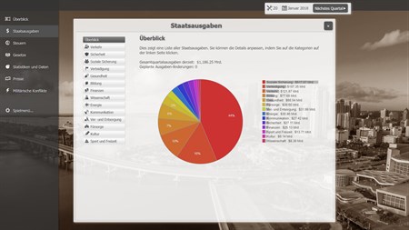 Das Spiel simuliert ein ganzes Land: Bevölkerung, Schulden, BIP, Wirtschaftswachstum, Arbeitslosigkeit, Kriminalität, Lebenserwartung, Geburtenrate, Sterblichkeitsrate, Stand der Infrastruktur und so weiter. Der Spieler kann Budgets, Steuern, Gesetze anpassen und sehen, was das Ergebnis ist.