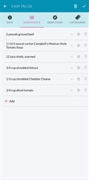 RECIPES • Enter your own recipes or copy/paste the ingredients and directions from the source. • Store a link to web recipes. • Put your recipes into multiple categories to make them easier to find such as "Chicken" and "Crockpot". • Link Ingredients to Items in the catalog