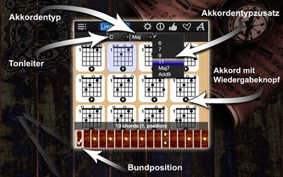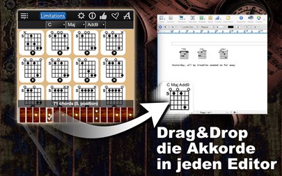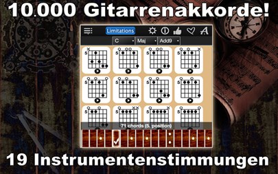 Diese App bietet Ihnen Folgendes: - Die Anzahl der Akkorde: 10000. - Eine einzigartige Option erlaubt Ihnen, sich jeden angezeigten Akkord anzuhören. - Drag&Drop ermöglicht die Speicherung der von Ihnen ausgewählten Akkorde (für Ihre eigenen Song-Kollektionen). - Die App unterstützt 56 Akkordtypen: Maj, Maj 6, Maj 7, Maj 9, Maj 11, Maj 13, Maj Maj7, Maj Add9, Min, Min 6, Min 7, Min 9, Min 11, Min 13, Min Maj7, Min Add9, Dim, Dim 6, Dim 7, Dim 9, Dim 11, Dim 13, Dim Maj7, Dim Add9, Aug, Aug 6, Aug 7, Aug 9, Aug 11, Aug 13, Aug Maj7, Aug Add9, Sus2, Sus2 6, Sus2 7, Sus2 9, Sus2 11, Sus2 13, Sus2 Maj7, Sus2 Add9, Sus4, Sus4 6, Sus4 7, Sus4 9, Sus4 11, Sus4 13, Sus4 Maj7, Sus4 Add9, 5, 5 6, 5 7, 5 9, 5 11, 5 13, 5 Maj7, 5 Add9, - Echter Gitarrenklang. - Alle üblichen Gitarrenstimmarten erhältilich: 1. Standard, 2. New standard, 3. Lute, 4. Half tone flat, 5. Whole tone flat, 6. Half tone sharp, 7. Whole tone sharp, 8. Drop B, 9. Drop C, 10. Drop D, 11. Double dropped D, 12. Celtic, DADGAD 13. DADADD, 14. Open A, 15. Open C, 16. Open D, 17. Open E, 18. Open G, 19. Slide open A, 20. Standard C, 21. Esus, 22. Drop C#, 23. Low C, 24. All Fourth, - Die App unterstützt linkshändige Gitarrenspieler. - Einstellbare Lautstärke.