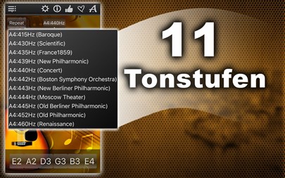 App-Highlights: * Chromatic Tuner mit Audio-Eingang- und Mikrofon-Unterstützung, * Tongenerator mit dem Original-Klang einer akustischen Gitarre, * Automatische Wiederholung vom Tönen, * 11 Tonstufen: + Baroque, + Scientific, + France1859, + New Philharmonic, + Concert Pitch, + Boston Symphony Orchestra, + New Berliner Philarmoniker, + Moscow Theater, + Old Berliner Philharmoniker, + Old Philharmonic, + Renaissance.