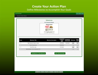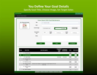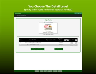 - Create Vision Boards To Accomplish Your Goals - Create Multiple Vision Boards As Needed and Desired - Choose From Various Backgrounds - Create Key Milestones with Target and Completion Dates - Create Major and Minor Tasks within Each Milestone - Keep Track of Specific Notes at Each Level - Special Recognition (within your app) For Completed Goals - 'Next Step' Button Reminds You of Your Next Priorities - Always Keep Your Vision Board With You and Before You - Accessible Via Mobile Phone, Tablet or Desktop App - Take Your Business/Personal Vision and Your Life to the Next Level