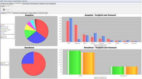 Das Programm beinhaltet verschiedene Filter mit denen Sie Ihre Datenansicht aus verschiedenen Perspektiven betrachten können. Haushaltsausgaben, Essen, Parkscheine, Versicherungen und vieles mehr werden nun übersichtlich zusammengefasst und dargestellt. Ebenso können feste Zahlungen in monatlichen oder jährlichen Abständen hinzugefügt werden.