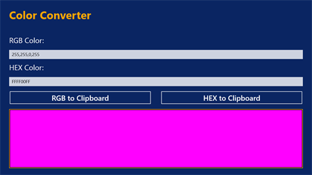 With HEX/RGB Color Converter, you can easily convert color from HEX value to ARGB value, and vice versa. Additionally, you can easily copy these values to Clipboard. The conversion happens automatically when you finish typing with key 'Enter' or clicking anywhere else, so that you don't have to do any extra move.