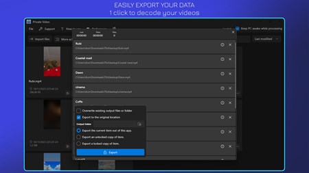 Password-protect video browser to secure your sensitive data and decrypt your data back easily. ???? Encrypt and decrypt multiple videos at once. ???? All processing is performed locally on your computer where your videos remain safe and private. Enjoy peace of mind when storing sensitive data or securely sharing data.
