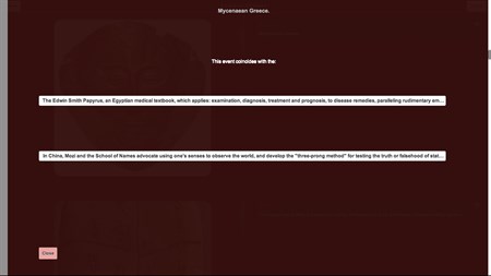 Another app about History. Useful for Historians and History enthusiasts. This app contains 4 sections: - Natural History: This timeline of Natural History summarizes significant cosmological, geological and biological events from the formation of the Universe to the rise of modern humans. (From 13,798 ± 0,037 Ma to 0.2 Ma) - Human Evolution: The timeline of Human Evolution outlines the major events in the development of the human species, and the evolution of humans' ancestors. It includes a brief explanation of some animals, species or genera, which are possible ancestors of Homo. (From 4000 Ma to 12 ka) - Ancient History: Timeline of Ancient History is the historical events in time of the documented ancient past from the beginning of recorded history until the Early Middle Ages. (From 3500 BC to 476 AD) - Middle Ages: Timeline of the major events during the Middle Ages, a time period in human history mostly centered on Europe, which lies between classical antiquity and the modern era. (From 410 AD to 1499 AD) Include more than 50 questions about the other simultaneous events. You may help us to improve this app by send free picture via Email (in app).