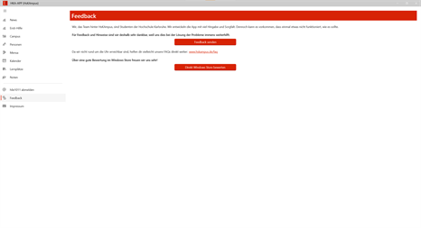 Wir freuen uns außerdem über jede Form von Feedback zur HKA-APP! Sollte einmal etwas nicht so wie versprochen funktionieren, kannst du dich jederzeit via Facebook oder support@hskampus.de direkt an uns wenden.