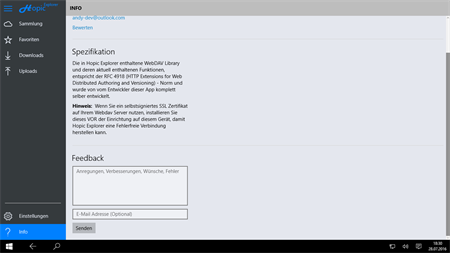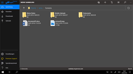 Hopic Explorer ist ein kompletter WebDAV Client, mit welchem Sie auf jeden WebDAV-Standardisierten Server (z.B. ownCloud & Nextcloud) zugreifen und Ihre Daten verwalten können. Musik- und Videostreaming, sowie viele weitere Funktionen werden ebenfalls unterstützt. Zudem bietet Hopic Explorer die Möglichkeit, die von Ihnen ausgewählten Verzeichnisse, automatisch auf Ihren WebDAV Server synchronisieren zu lassen. Dies kann z.B. dafür genutzt werden, um neue Fotos automatisch hochzuladen. Für flexibles arbeiten bietet Hopic Explorer volle Continuum Unterstützung und für zusätzliche Sicherheit Ihrer Daten, steht Windows Hello zur Verfügung. Dank eines Einrichtungsassistenten ist die Konfiguration in wenigen Schritten erledigt. Je nach Geschmack bietet Hopic Explorer zudem ein helles, sowie ein dunkles Design.
