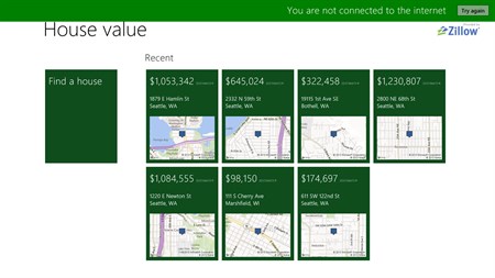 House value is for people who want to keep track of their house value or keep track of a few houses you care about. Powered by Zillow data, get the latest Zestimate, see some quick stats, look at some charts and monitor changes from the live tile. Pin your favorites houses to the Start screen to get the data without opening it.