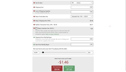 Selling on Ebay just became easier! With HowMuch, you can easily calculate your Ebay and PayPal fees before you sell--not after. By giving you a complete breakdown of expenses and proceeds, HowMuch can help you sell what you love while still making a profit. Whether you're constantly buying and selling rare collectibles for a profit, or you're simply selling your old phone for some extra cash, HowMuch can show you your return on investment. Start selling today!