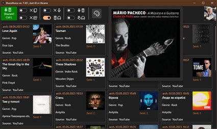 The program listens to music on your computer and identifies the track using a service on the Internet. The result is displayed on the screen and sent to the clipboard (in the format: I used to detect Money For Nothing by Dire Straits) and to an external program. The text in the clipboard can be parsed by the program "Data for LastFM" and the track will be scrobbled by the last.fm service. The program is controlled by buttons, toggles and context menus.