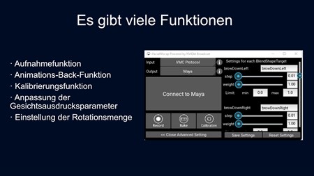 Die in Echtzeit erfassten hochwertigen Gesichtsanimationsdaten können an viele 3D-Softwareprogramme wie Blender, Unity, UnrealEngine, Maya und 3dsMax gesendet werden, um benutzerdefinierte Charaktere zu erstellen.