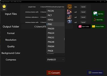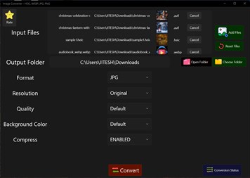Convert 240+ Image formats to 170+ Image Formats including: HEIC, HEIF, WEBP, GIF, PNG, JPEG, ICO, PDF, TIFF, BMP, SVG, JPG & 160+ more formats Supports Conversion from HEIC / HEIF to WEBP, GIF, PNG, JPEG, JPG, ICO, PDF, TIFF, BMP, SVG & 160+ more formats Supports conversion from and to WEBP, GIF, PNG, JPEG, JPG, ICO, PDF, TIFF, BMP, SVG & 160+ more formats Supports Batch Conversion. Convert Multiple Files in one go Drag and Drop File Support Supports Resizing of the image. Change Resolution for the image Supports Compression of the images Watermark free Output High Performance & fast conversion Ad-free