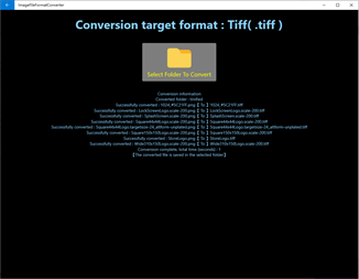 The conversion process information can be listed in detail, as well as the total time of the conversion. Convert all picture files in the folder into Jpeg, JpegXR, Png, Tiff picture formats, keeping the photo quality consistent. Supports batch conversion of multiple pictures. Select the folder to convert, the picture files in the entire folder will be quickly converted to Jpeg, JpegXR, Png, Tiff format; more convenient and time-saving. The converted file is saved in the selected folder.