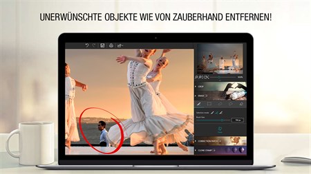 NEU! Ausbessern Mit diesem neuen, extrem schnellen Korrekturwerkzeug entfernen Sie Mängel und klonen oder füllen einen Bildbereich mit einem einzigen Mausklick. Schwer "rekonstruierbare" Bereiche lassen sich jetzt noch einfacher überarbeiten. Selbst in komplexen Bildbereichen (wie Stufen, Farbtönen im Himmel etc.) können Elemente hinzugefügt oder entfernt werden.