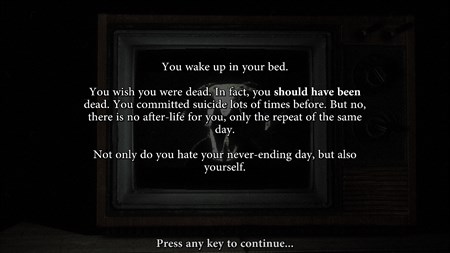 Madness in Infinite Loop is a story about a man who is doomed to wake up to the same morning, no matter what he does. You want to die, but you wake up in your bed each time you die. When nothing you do matters, can you keep your sanity and morals? ****