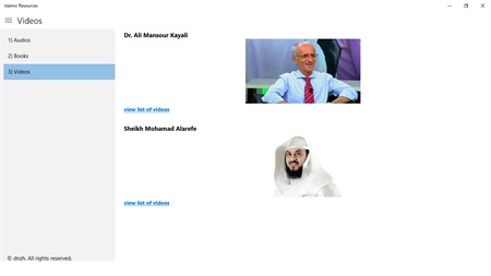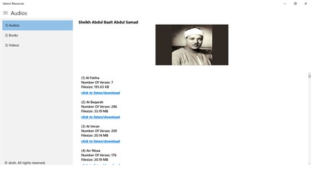 Collections of various Islamic Resources such as audios - listen/download The Holy Quran (mp3 format) by famous reader (Sheikh Abdul Basit Abdul Samad, and Sheikh Abdul Rahman Al Sudais), books - read/download in (pdf format) famous books (Sahih Bukhari, Sahih Muslim, Stories Of The Prophets, Stories Of The Quran just to name a few), and lectures/videos - listen/watch videos by famous scholars (Dr. Ali Mansour Kayali, Dr. Mohamad Al Arefe, and others)...