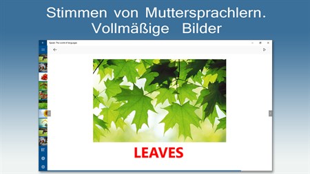 iSpeak ist eine leistungsstarke Anwendung, die erstellt wurde, um Kindern und Anfängern zu helfen kostenlos Mutter- und Fremdsprachen zu lernen. Durch die Verwendung unserer Anwendung werden Sie Ihren Wortschatz schnell erweitern und in die Lage versetzt, in der Zielsprache wie ein Muttersprachler zu sprechen. Mit iSpeak können Sie die folgenden Sprachen lernen: • Englisch • Chinesisch • Portugiesisch • Deutsch • Russisch • Spanisch • Polnisch • Ukrainisch Das Programm enthält kostenlose Lektionen, die Ihnen schnell und effektiv helfen werden, neue Wörter zu lernen und Ihren Wortschatz zu erweitern. Unser Lernansatz ist auf populären Vorgehensweisen aufgebaut, unter anderem der Doman Flashcards Methodik, die erfunden wurde damit Kinder, die noch nicht einmal sprechen können, sehr schnell neue Wörter lernen. Wir verbesserten die Doman Flashcards Methoden durch unsere internen Forschungen und Algorithmen, die wir zusammen mit Sprachlehrern entwickelt haben. Das Ergebnis ist eine Anwendung, die sicher eine der besten in der Welt ist, um Fremd- und Muttersprachen zu lernen. Mit iSpeak können Kinder, Anfänger und Fortgeschrittene Unterrichtsstunden mit neuen Wörtern absolvieren und leicht und spielerisch eine neue Sprache sprechen. Die Anwendung hat eine sehr einfache und verständliche Implementierung, die leicht von Kindern benutzt werden kann.
