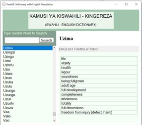 KamusiKingereza is a simple app that tries to explain the meanings of Swahili words in the english language. It is not a word to word translation but rather a word to meaning translation.