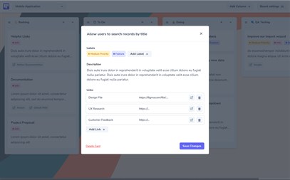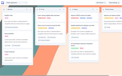 - Create unlimited and fully customizable Kanban boards. - Create and order columns to fit your project's needs. - Create unlimited custom labels from a varied colour palette. - Cards can be added to columns and then moved (drag and drop) as they progress. - Cards can be as detailed as you wish, with a title, description, labels, resource links and To-Do lists.