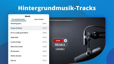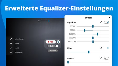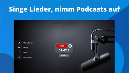 Wenden Sie verschiedene Effekte an, um den Klang abwechslungsreicher zu gestalten - lassen Sie Ihre Stimme raumgreifend und üppig oder eher trocken und ruhig klingen. Fügen Sie Ihre eigenen Musiktitel hinzu und spielen Sie sie während des Streams im Hintergrund ab. Speichern Sie die Aufnahme, die Sie gemacht haben, und veröffentlichen oder teilen Sie sie im Web! Die App bietet u. a. folgende Funktionen: Verstärkungsregelung, automatische Aufnahme, Soundeffekte, Equalizer-Voreinstellungen, Mikrofonprüfung.