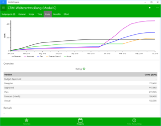 • Anzeige all Ihrer Projekte • Hervorhebung Ihrer favorisierten Projekte • Ansicht von Projektstrukturen, allgemeinen Daten, Projektgegenstand, Terminplan (Meilensteine und Arbeitspakete), Kosten, Nutzen, Aufwand (jeweils mit Liniendiagramm und Tabelle der aggregierten Werte) • Erfassung Ihrer Arbeitszeiten und Abschluss der Zeitabrechnungsperiode • Individuelle Benutzereinstellungen