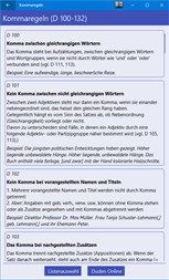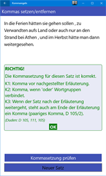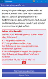 Interaktives Übungsprogramm für die Verwendung von Kommas im Deutschen. Kurze Sätze können interaktiv mit Kommas an beliebigen Stellen versehen werden. Das Feedback zeigt auf, ob die Kommas korrekt gesetzt wurden und begründet dies anhand der verwendeten Kommaregeln. Die Sätze können auch inklusive Kommas angezeigt werden. Anklicken der Kommas zeigt die entsprechende Kommaregel. Die Kommaregeln halten sich an den Aufbau im „Duden online“ (2017), sind aber vereinfacht.
