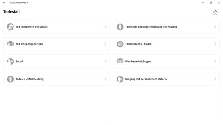 * Edukativ aufbereitete Checklisten zur Ereignisbewältigung während und nach einer Krise, um die erlebten Vorkommnisse (z.B. Amokdrohung, Grossbrand, Hochwasser, Noteinsatz des Zivilschutzes, Todesfall einer Schlüsselperson, zielgerichtete Gewalt usw.) aufzuarbeiten und Krisenfolgen zu lindern