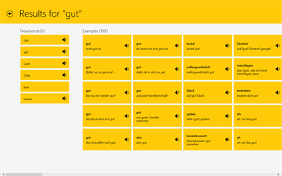 • Aktueller Wortschatz aus allen Stilebenen der Allgemeinsprache • Umfangreiche Fachterminologie aus allen wichtigen Gebieten • Zusatzangaben: Anwendungsbeispiele, Bedeutungsdifferenzierungen und grammatische Erläuterungen • Umfassendes Nachschlagewerk für professionelles Übersetzen in Beruf, Lehre und Studium •Volltextsuche innerhalb der Wörterbücher und Einträge, um nach Beispielen zu suchen. •Aussprachebeispiele von Muttersprachlern zum Anhören (verfügbar für die Sprachen Deutsch, Englisch, Französisch, Italienisch, Spanisch und Russisch). • Suchverlauf ist vollständig durchsuchbar und synchronisiert sich auf all Ihren Windows 8 Geräten • Panoramamodus • Snap View