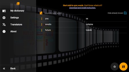 Watching foreign-language movies with subtitles is the most effective way to learn the language. This program makes this way of learning simpler and more comfortable. Just tap unknown words and explore translations. Add unknown words and phrases to your user dictionary for learning Anki, a great application for memorizing anything you want.
