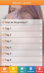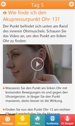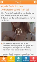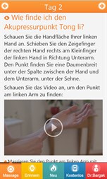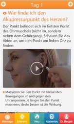 Das können Sie sofort mit der App erreichen: → Für die nächsten 10 Tage bekommen Sie jeden Tag einen leicht zu findenden Massagepunkt → Die Reihenfolge der Punkte wurde von mir persönlich so entwickelt, dass der Behandlungseffekt maximiert wird → Sie werden täglich an Ihren Massagetermin erinnert, um keinen Termin zu verpassen und dadurch den Behandlungserfolg zu maximieren