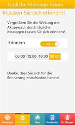 √ Zeitraubende Arztbesuche sind nicht erforderlich. √ Nennenswerte Geldausgaben sind nicht notwendig. √ Es besteht keine Gefahr der Verletzung, Infizierung oder Schmerzen. √ Sie massieren die Punkte sanft mit Ihrem Finger. √ Die App erinnert Sie automatisch an Ihre Massagetermine.