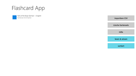 Mit dieser App kannst du viel einfacher lernen. Ideal ist sie, um Sprachen zu lernen. Du kannst aber auch jedes andere Thema, welches sich in Fragen und Antworten aufteilen lässt, mit dieser App lernen. Erstelle die Fragen&Antworten in einer Tabelle, speichere sie als csv-Datei und importiere sie in die App.
