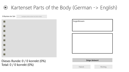 Um die Karten zu lernen gibt es zwei Modi: lesen&schreiben: Du siehst die Frage und schreibst die Antwort in das Antwort-Feld hinein. Die App prüft dann, ob deine Antwort korrekt war. lesen&wissen: Du siehst die Frage und überlegst dir daraufhin die Antwort. Dann klickst du auf den Button, um die Antwort zu sehen. Anschliessend entscheidest du, ob du die Antwort richtig gewusst hast.