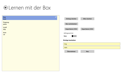 Diese App unterstützt das Lernen von Vokabeln und anderen Lerninhalten. Sie beruht auf einer Idee (Lernbox) von Sebastian Leitner aus dem Jahr 1972. Es werden dabei zwei aus der Lernpsychologie Prinzipien berücksichtigt: - Assoziatives Lernen - Prinzip der Wiederholung