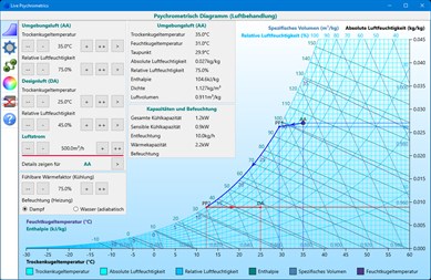 Diese App bietet vier verschiedene Berechnungen und zeigt die Ergebnisse sowohl in einem Fenster als in einem Diagramm: 1. Luftbehandlung Berechnet, wie eine gegebene Umgebungsluft in eine erforderliche Entwurfsluft umgewandelt wird. Die erforderlichen Schritte sind Kühlen mit einem gegebenen fühlbaren Wärmefaktor, Entfeuchten, Heizen und Befeuchten (adiabatisch und Dampf). Abhängig von den gegebenen und erforderlichen Luftbedingungen sind einige dieser Schritte möglicherweise nicht erforderlich.