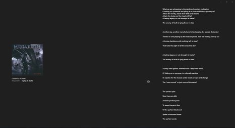 Notes: - The app works with apps that integrate with the Windows Global Media Controls (e.g. Holla!, Groove Music, Spotify, etc...) - The app may not be able to find lyrics for youtube videos where the channel name (usually used as the artist name by the browser/app) or the song name don't match the real song information. I'm working on finding a way around this.