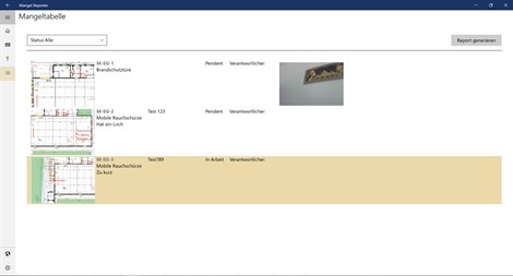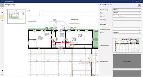 Einfaches Tool optimiert für Microsoft Surface Pro 4 zur Erfassung von Mängeln und Hinweisen in Gebäuden und auf Baustellen. Die Mängel können in PDF-Plänen lokalisiert und mit Fotos und Hintergrunddaten hinterlegt werden. Die erfassten Mängel lassen sich in einer Listenansicht filtern und daraus in wenigen Klicks ein PDF-Report erstellen welcher noch auf dem nach Hause Weg an die verantwortlichen Personen versendet werden kann.