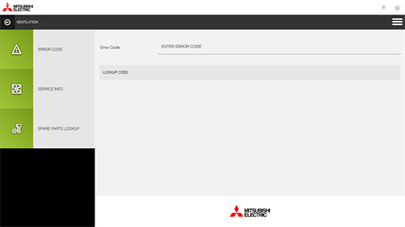 Zu den Funktionen zählen: Nachschlagen und Diagnostizieren von Störmeldungen und LED-Fehlercodes, Berechnen der Kältemittelnachfüllmenge, Temperaturfühlerwerte, Testen der City Multi DIP-Schalter, WiFi-Schnittstelle und Auslesen von Matrix-Codes sowie direkte Links zu aktuellen Support-Unterlagen und Informationen über neueste Produkte.
