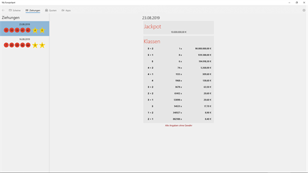 #FEATURES - Speichere alle deine Spielscheine - Historie der letzten Ziehungen. - Quoten. - Lass dir die Eurojackpot Ziehungen zuverlässig und schnell anzeigen. - Werte deinen Spielschein aus (Vollversion). -> Siehe direkt auf der Startseite, welche Scheine wann gewonnen haben. -> Erhalte auf der Scheinseite eine detaillierte Übersicht über die Gewinne .
