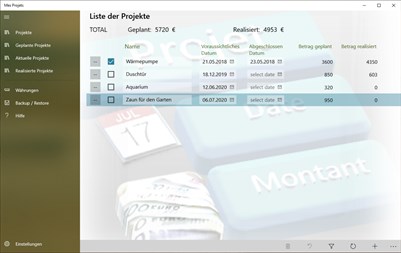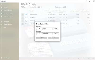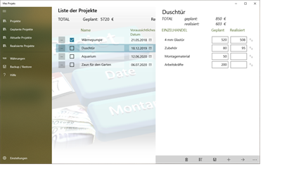 Mit dieser Anwendung können Sie endlich die Kosten für Ihre Projekte verwalten. Es ist daher möglich, dass Sie Ihre Projekte über einen längeren Zeitraum in Abhängigkeit von Ihrem Budget verteilen und sogar den Unterschied zwischen dem Betrag und dem realisierten Betrag kennen. Alle Projekte durchlaufen 3 Zustände: geplant, aktuelle und realisiert. Jedes Projekt kann mit einem geplanten und realisierten Budget in mehrere Aufgaben aufgeteilt werden. Die Gesamtsumme dieser verschiedenen Aufgaben lieferte den gesamten Haushalt (geplant und realisiert). Wenn Sie einem Vorgang ein Budget zuordnen, ändert sich der Status des Projekts automatisch in die Liste der "aktuellen" Projekte. Sobald alle Aufgaben einen realisierten Betrag haben, definieren Sie ein Projektenddatum. Sie können dann das Kontrollkästchen aktivieren, um anzuzeigen, dass das Projekt abgeschlossen ist. Anschließend wird automatisch die Kategorie " Realisierte Projekte" aufgerufen.