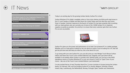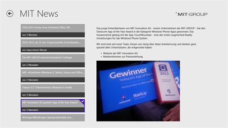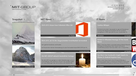 Die Windows 8 App der MIT-GROUP bietet Ihnen aktuelle Informationen zu unseren Produkten, Hinweise bei Service-Unterbrüchen und weitere Neuigkeiten. Darüber hinaus präsentieren wir eine Auswahl von Webcams mit wunderschönen Sujets aus der ganzen Schweiz. Des Weiteren gibt es eine Kategorie 'IT News', die eine Auswahl an relevanten Artikeln zu Themen aus der IT, Windows-Welt, Gadgets, Business-Applikationen, etc. aggregiert und ansprechend visualisiert. Durch diese News können Sie bequem navigieren und haben die Möglichkeit, den gesamten Artikel zu lesen oder mit Bekannten zu teilen. Die App wird laufend erweitert und ist ein kostenloses Angebot der MIT-GROUP.