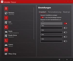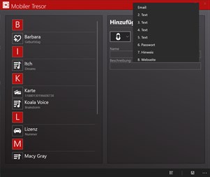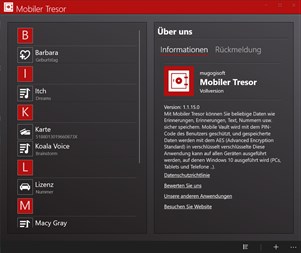 Mit Mobiler Tresor können Sie beliebige Daten wie Erinnerungen, Erinnerungen, Text, Nummern usw. sicher speichern. Mobile Vault wird mit dem PIN-Code des Benutzers geschützt, und gespeicherte Daten werden mit dem AES (Advanced Encryption Standard) in verschlüsselt verschlüsselte Datenbank Diese Anwendung kann auf allen Geräten ausgeführt werden, auf denen Windows 10 ausgeführt wird (Desktop, Tablet, Mobile). Wir würden uns freuen, wenn Sie uns Feedback senden und wenn Sie einen Fehler an unsere E-Mail-Adresse melden, geben Sie bitte das Datum des Fehlers oder der falschen Übersetzung an, basierend auf Gerätetyp, Betriebssystem und Versionsnummer der Anwendung.
