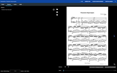 MobileSheets ist der erstklassige Musiknoten-Manager für Windows 10 Geräte. Es befreit Sie davon, Bücher und Ordner herumschleppen zu müssen und ermöglicht Ihnen, innerhalb von Sekunden auf jedes Notenblatt in Ihrer Bibliothek zuzugreifen. Darüber hinaus bringt es eine Reihe von leistungsstarken Fähigkeiten für Musiker mit: - mehrere Betriebsarten wie zwei Seiten nebeneinander, um halbe Seiten weiterblättern und vertikales Scrollen von Seiten - umblättern ohne Benutzung der Hände mit allen Bluetooth- oder USB-Pedalen (zwei und vier Pedale) oder mit Hilfe der automatischen Scroll-Funktion - Notiz-Funktion für Anmerkungen in den Noten mit Freihandzeichnen, Formen-, Text- und Stempel-Werkzeugen - maßgeschneiderter Audiospieler zum Abspielen von Tonspuren zusammen mit den Noten. Der Audiospieler unterstützt A-B-Loops und mehrere Größen - Metronom mit mehreren Anzeigearten und Klangeffekten - Lesezeichen für schnellen und einfachen Zugriff auf einzelne Abschnitte in den Noten - Sprungmarken um Wiederholungen zu handhaben und um schnell von einer Seite zur anderen zu springen - Unterstützung für mehrere Dateiformate einschließlich Bild-, PDF-, Text- und ChordPro-Dateien - die Fähigkeit, Akkorde in Text- und ChordPro-Dateien zu transponieren - manuelles und automatisches Beschneiden von unnötigen Rändern - Unterstützung von Setlisten und Sammlungen zum effektiven Gruppieren der zu spielenden Stücke - ein leistungsfähiges Bibliotheksmanagement mit einer umfangreichen Liste unterstützter Metadaten-Felder gibt Ihnen die vollständige Kontrolle über die Daten in Ihrer Bibliothek - ein Companion-Programm für den PC macht das Erstellen und Bearbeiten der Songs zum Kinderspiel