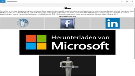 Motherland ist eine App, die das prächtige Wahrzeichen der Statue als atemberaubendes 3D-Modell zum Leben erweckt. Das immersive Erlebnis führt den Benutzer sofort zur historischen Stätte. Alle Fotos werden mit höchster Auflösung produziert. © Copyright Global Mobile Software LLC. Alle Rechte vorbehalten 2015-2020. Die App ist mehrsprachig und unterstützt 20 Sprachen: Հայերեն, English, Italiano, Français, Español, Deutsch, Português, Pусский, हिंदी, 中文, Norsk, Svenska, Suomi, Dansk, Nederlands, Polskie, Ελληνικά, Català, Română, 日本人